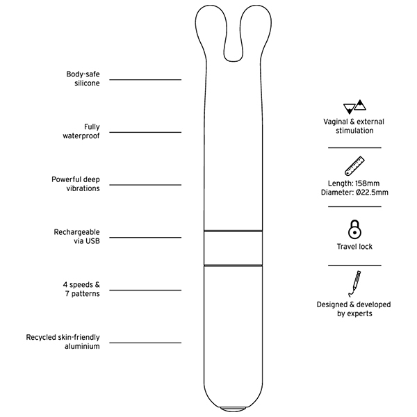 ●素材:シリコン、リサイクルアルミニウム、リサイクルABS樹脂、バイオプラスチック●充電方法:USB●充電時間:フル充電2時間●連続使用可能時間:最大1時間●振動パターン:10(振動強弱4段階+リズムパターン6種)●防水:完全防水(IP67)●トラベルロック機能つき