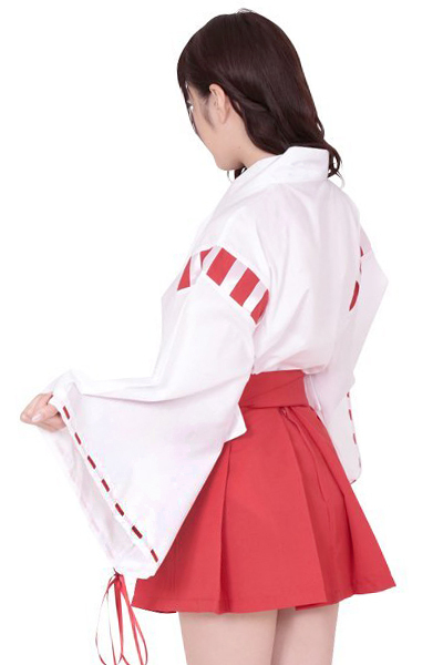 願い事があるなら、まずはお祈りしてね!白着物に赤のパイピングリボンが印象的な、巫女さんのコスチューム。