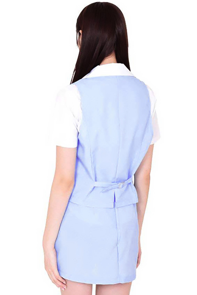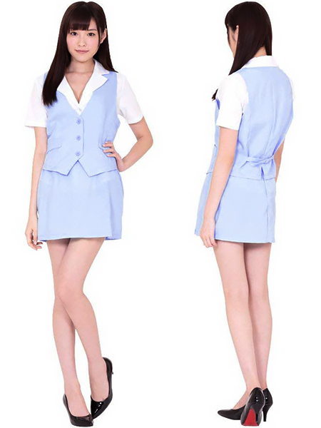 前面は3つボタンのスタンダード型OL制服で、白のブラウスにブルーのスカートの組み合わせが爽やかさ満点!セクシーなサイドスリットデザインも見逃せない!