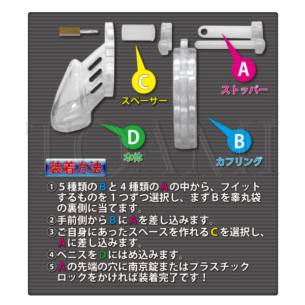 大きさの異なるカフリングとピンが付属していますので、フィット感の調節も可能です!また装着したまま排泄もできるので、装着後に付属の南京錠、またはプラスティックロックで鍵をかければ、日常的に拘束&勃起制限を行えます。