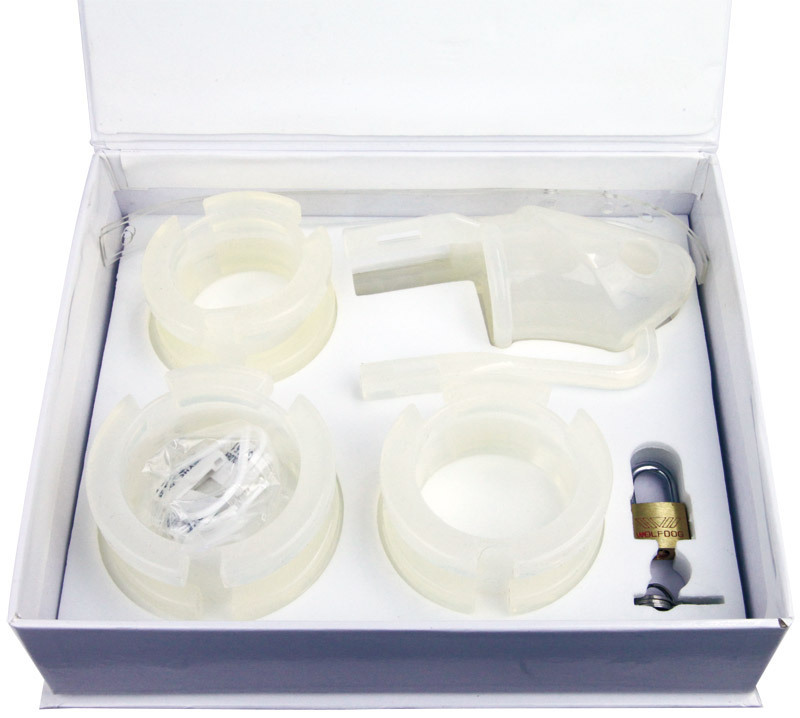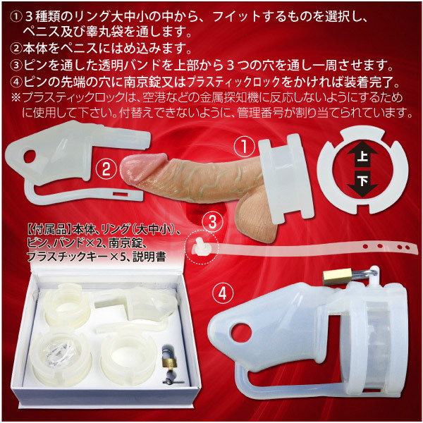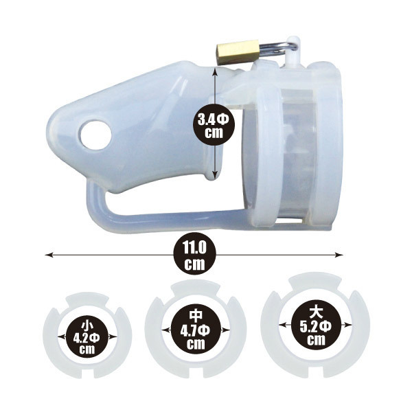 パッケージ:21.0×17.8×5.3cm 本体:全長11.0cm・ペニス挿入口内径3.4φcm・リング内径小4.2φcm、中4.7φcm、大5.2φcm セット内容:本体・リング3種(大中小)・ピン・バンド×2・南京錠・プラスチックキー×5・日本語説明書