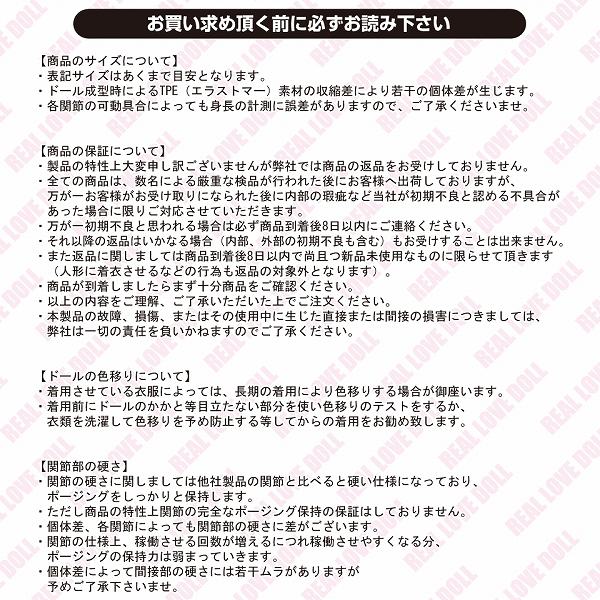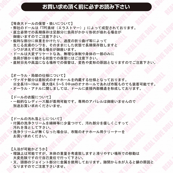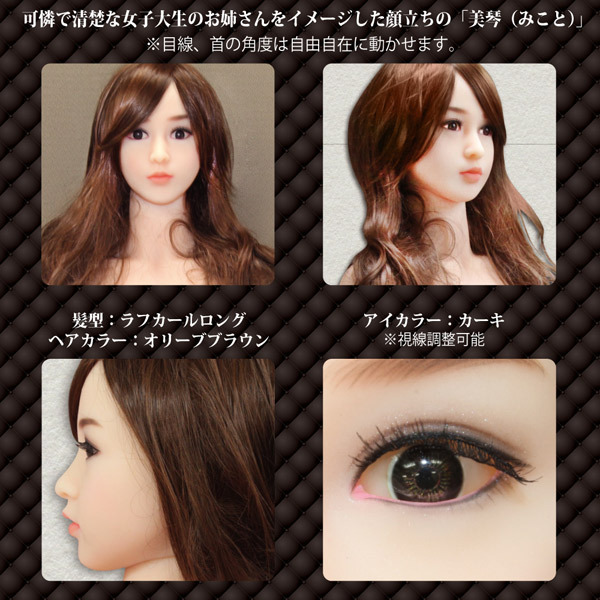 ●清楚な女子大生の美琴●最適限のメイク済みフェイス●ブラウンカラーのロングカールヘア●リアルな人肌感のグラマラスボディ●身長153cm・体重約32kg●B78cm・W56cm・H82cm●一般的な衣類のMサイズを着用可●各関節可動で様々な体位を実現●口はオーラルプレイにも対応●ヴァギナ:付属オナホール内蔵●アナルはドールに直接加工したヒダ構造●視線、首の角度調整も自在。