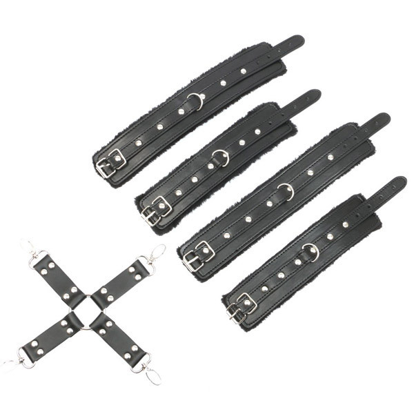●手枷×2個・足枷×2個●外側の黒ベルトは合皮素材●内側はもこもこアクリルファー●ベルト穴式でサイズ調整が可能●手足枷同士を繋ぐクロスベルト●お肌に痕が付きにくいので安心。