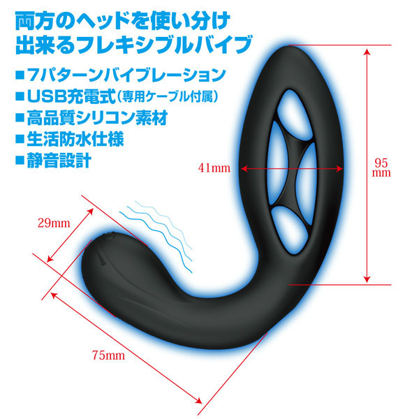 ●高品質シリコンのブラックボディ●一人でも挿入し易いL字フォルム●拡張プラグとバイブの双頭タイプ●男女兼用で使えるユニセックス系●アナル&ヴァギナ両方に挿入可●拡張に最適なアナルプラグヘッド●ボディが変形するユニーク設計●押し潰しながら挿入→内部で膨張●Gスポットを直撃する丸型ヘッド●7パターンの多彩な振動機能を装備●便利なUSB充電式(専用コード付属)●静音設計&生活防水仕様。