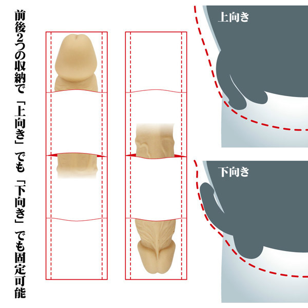 下向き固定の場合はクロッチをずらせばそのまま排尿も可能!ピタっと密着するので包皮を剥いたまま固定すれば、包茎矯正用としても効果を発揮します。