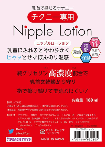 乳首専用に開発されたヒヤッとしないほんのり温感仕様のローション!擦り続けても乾きにくく潤い持続!純グリセリンを高濃度で配合し、お肌に優しい潤い保湿成分もin♪安心の日本製・内容量180ml。