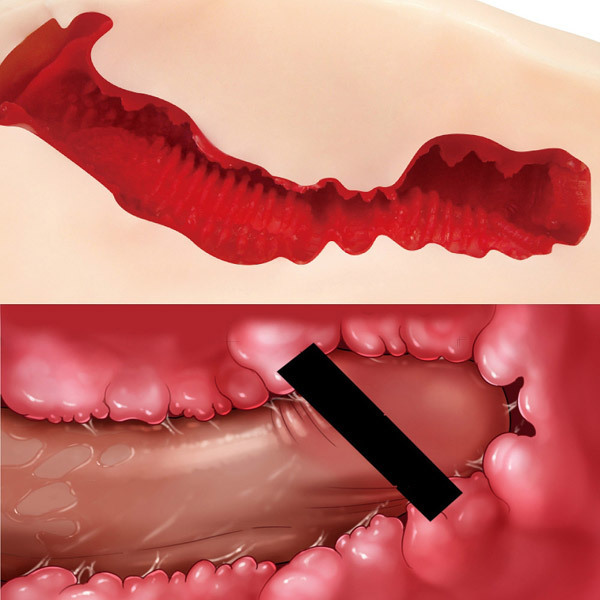 床や机に設置しやすいフラットな底面のすじまんボディは安定感抜群!アウターにはハードな床オナにも対応できる高弾力素材を使用!中は真っ赤に充血したねっとり粘膜ソフト素材です。