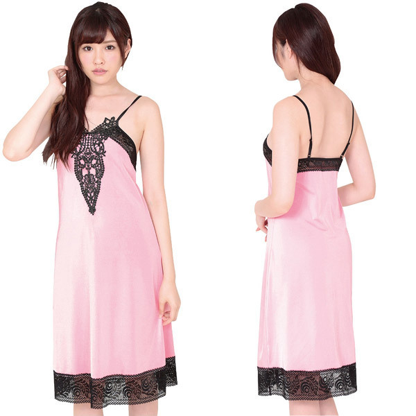 大人リッチな長め丈のロングスリップドレス!身頃は心地よい質感の淡いピンクサテン地、デコルテと裾は繊細レースで縁取った切り替えデザイン。