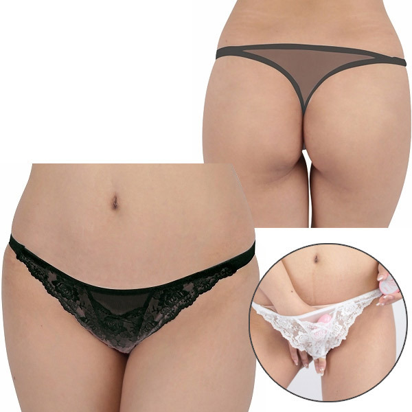 ローターポケット付きフラワーレースシースルーTバック ブラック
