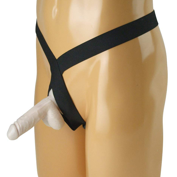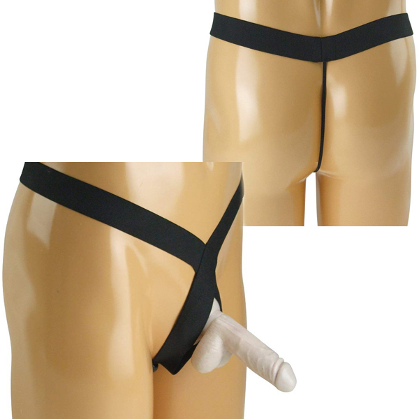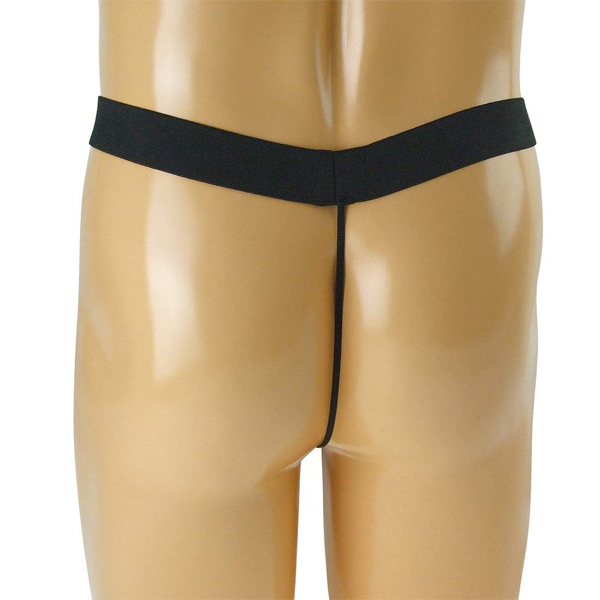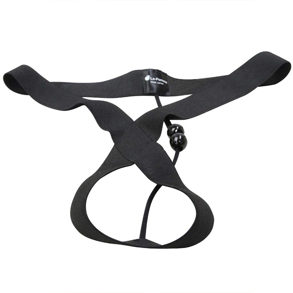 伸縮性のある黒の太ベルトで男性器を支える日本製Tバック。
