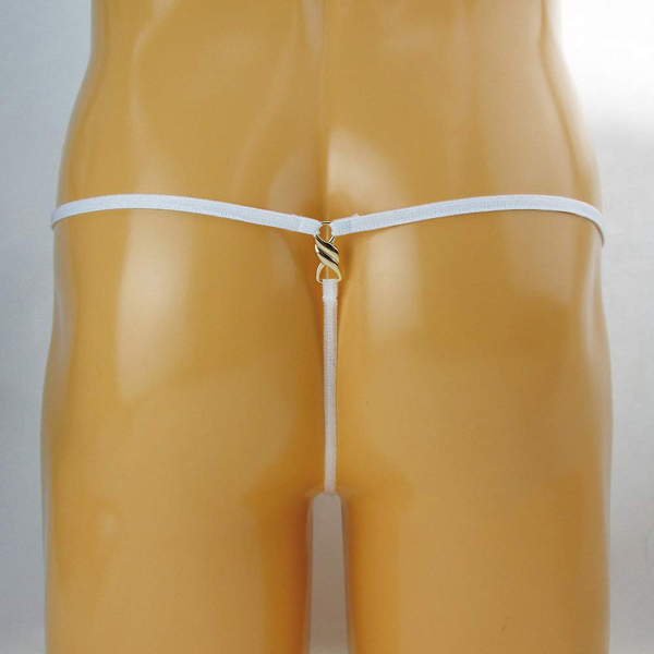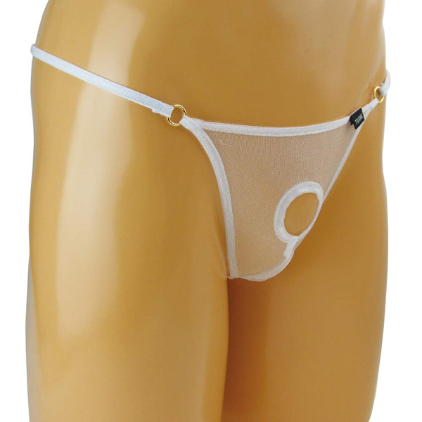 素肌が見えるシースルー生地でエロティックに見せつけるメンズ用Gストリング(白)。
