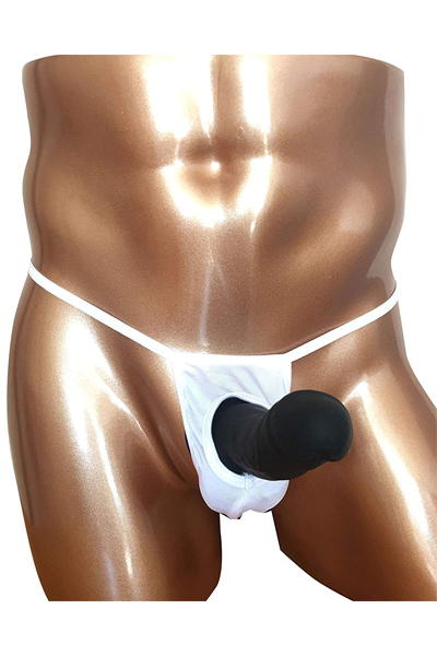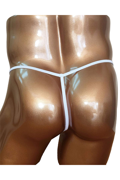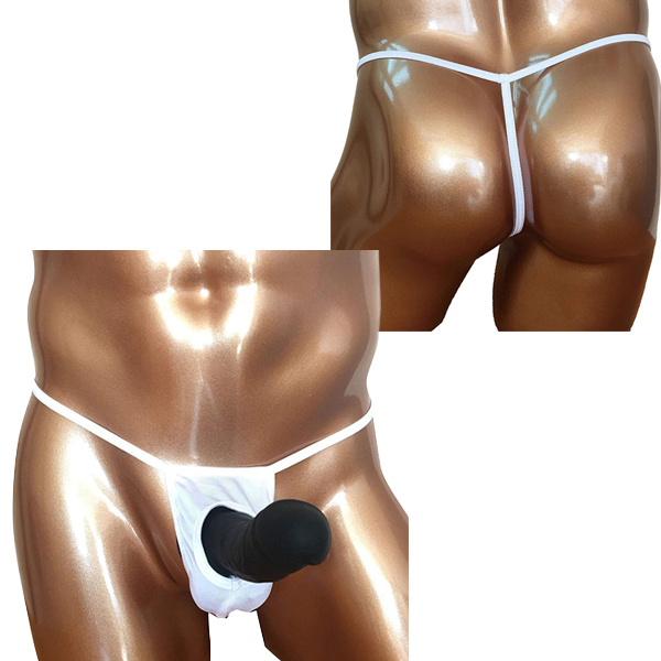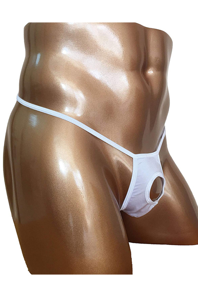 露出する開放感!男のシンボルを魅せつける竿出し仕様のメンズ用Tバック(白)。