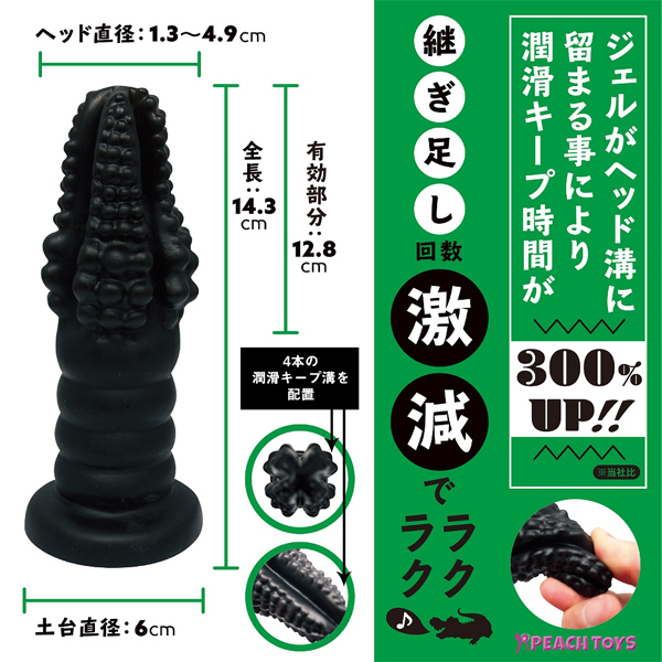 潤滑ローションが溜まる深めの溝を先端に4本配置したことで、乾きにくくした使い勝手の良いディルド!先端から下にいくにつれて大きさが増すワニ型ヘッドは、初心者〜上級者まで満足のいくサイズとなっております。
