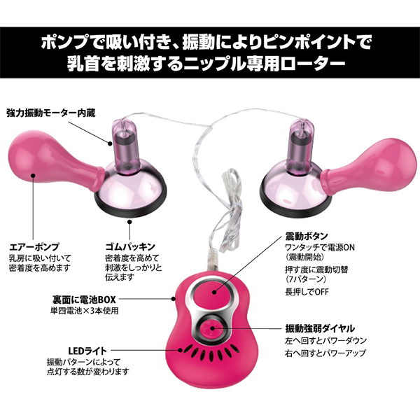ポンプで吸い付き、縁についたゴムパッキンでピッタリ密着!7段階の振動で乳首をピンポイントに責め立てる電池式ニップルローター。