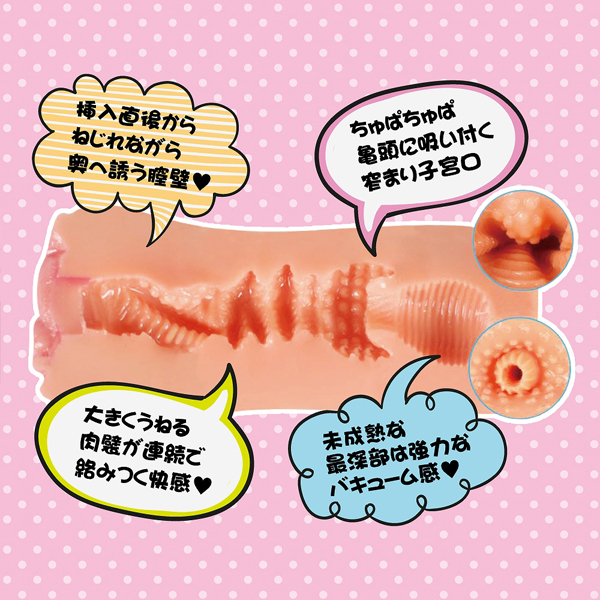 硬く閉じた入口を押し広げると、渦巻くスパイラル膣道が貴男を奥へ誘い、うねる肉壁が連続で刺激、キュンと締まる子宮口がチュパチュパと亀頭へ吸い付きます♪未だ成熟していない最奥の強力バキュームで絶頂へ!ローション付属