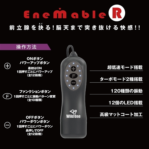 お手軽さが定評の前立腺開発グッズ「エネマブルR」に上級者タイプが登場しました!3段階に可動するアームで会陰部の刺激も自由自在♪12段階の強弱と10種類の振動パターンによる120種類の振動が前立腺を抉り出す!前立腺を刺激するために開発された洗練されたフォルムが悶絶のドライオーガズムへと導く♪3段階に可動するフックで会陰部への刺激も自由自在にお楽しみ頂けます!