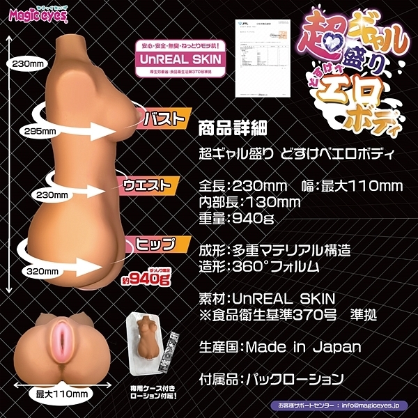 ボディ型ならではの様々な体位でも楽しめ、素材には厚生労働省:食品衛生法第370号基準に準拠した「UnREAL SKIN」を採用している贅沢なつくりとなっています。