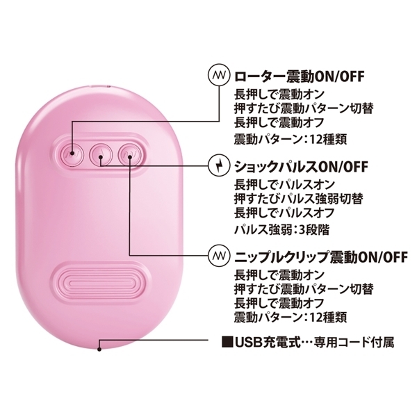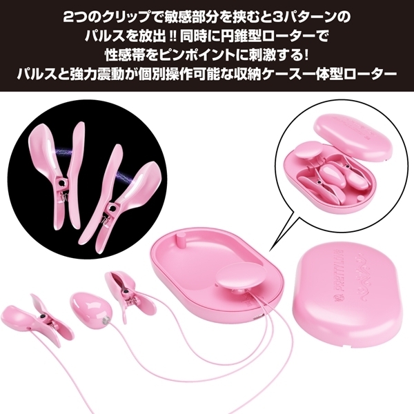 パルスと振動の2つの刺激を楽しめるユニークなアイテムです♪敏感な部分をクリップで挟み、3種類のパルスで心地よい刺激を与えます!同時に円錐型のローターが性感帯をピンポイントで刺激♪パルスと12パターンの強力な振動を別々に操作でき、リラックスした時間を演出します!収納ケース一体型で使いやすく、持ち運びにも便利♪USB充電式でエコに配慮しつつ長時間楽しめます!