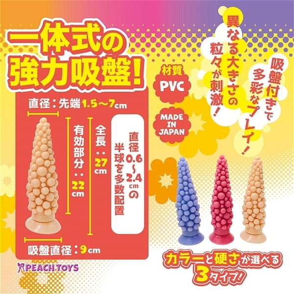 先端は小さく、段々と広がる円錐形状に大きさの異なる粒々がランダムに配置!直径0.6〜2.4cmの半球を多数配置●カラーと硬さが選べる3タイプ!<ソフトスキン>肌色のソフトタイプ。