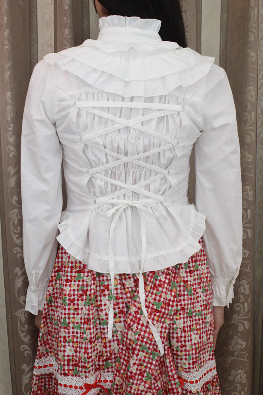 立襟のフリルがとっても可愛く、肌触りが良いので着心地も良好!バックはシャーリング入りの編み上げになっており、ゴスロリやコスプレ衣装とも相性抜群!一枚は持っておきたいキュートなブラウスです。