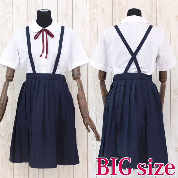 BIGサイズ:B85〜112cm・W76〜91cm 上衣:着丈69cm・袖丈27cm・肩幅45cm スカート:着丈61cm・吊り紐88cm(1本) セット内容:上衣シャツ、吊りスカート(三段ホック)、紐タイ 素材:上衣シャツ(ポリエステル65%綿35%)、スカート(ポリエステル100%)