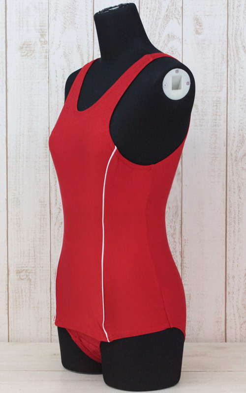 シンプルなデザインに鮮やかな赤がマッチング!伸縮性があるので着やすさも着心地もバツグンな水着コスチュームです。