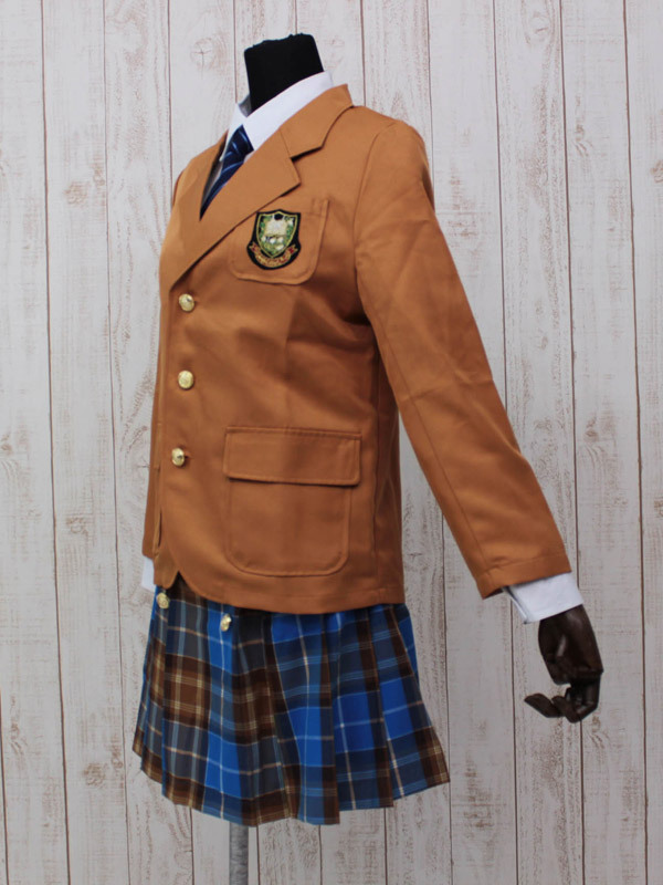 キャメル色ブレザーと青チェックスカートがクラシカルな冬服タイプの制服コスチューム。