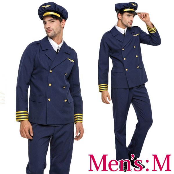落ち着きのある紺の制服にゴールドカラーがアクセント!最高にCOOLな男を演出してくれるメンズ用のパイロット風ハロウィンコスプレ♪ジャケットは着脱しやすい前ボタン仕様、付襟やネクタイなど小物付き。