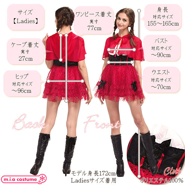 Ladiesサイズ:B〜90cm・W〜70cm・H〜96cm・身長155〜165cm・ケープ丈27cm・ワンピース丈77cm セット内容:フード付きケープ、ワンピース(背面ファスナー、スカート部に裏地あり) 素材:ポリエステル100%