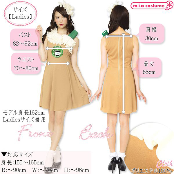 ハロウィンやクリスマス仮装、変装用のステージ衣装や舞台衣装として注目されること間違いなし!コーヒーカラーのワンピースはストレッチ素材で着やすく付属のシールを胸元に付ければキュートなカフェスタッフに!ふわっと裾の広がったスカートで女性らしい印象を出しちゃおう♪