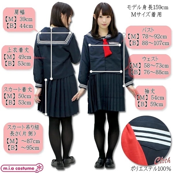 Mサイズ:B78〜92cm・W58〜73cm・肩幅39cm・袖丈54cm・着丈(上衣49cm、スカート50cm)・吊り紐の長さ(片側)〜87cm セット内容:上衣(前開きボタン留め)、吊りスカート(横ファスナー、アジャスター調整可)、タイ 素材:ポリエステル100%