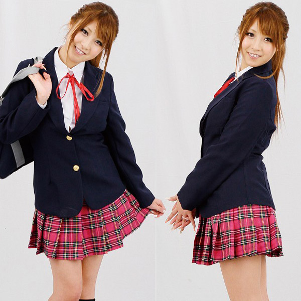 リボン付きブラウス、ブレザー、スカート、さらにハイソックスまでセットになった充実の制服コスプレです。