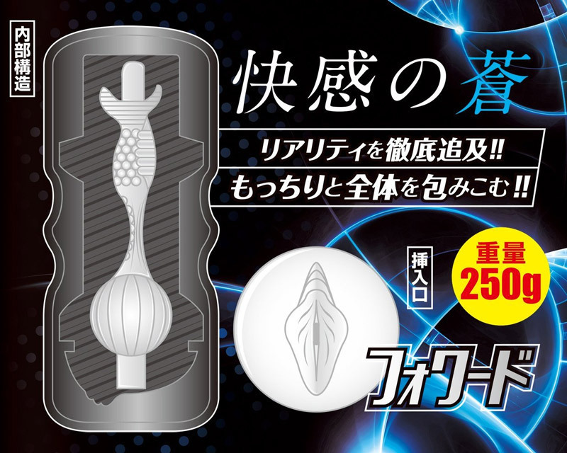 ●黒×青のスタイリッシュな外観●陰唇がはみ出たリアルな挿入口●底部にある空気穴を塞いで吸い付きをコントロール●意外と重みを感じる肉厚のシリコンホール●ストレートな膣穴に縦横ヒダ&イボを組み合わせた快感ギミックを設置。