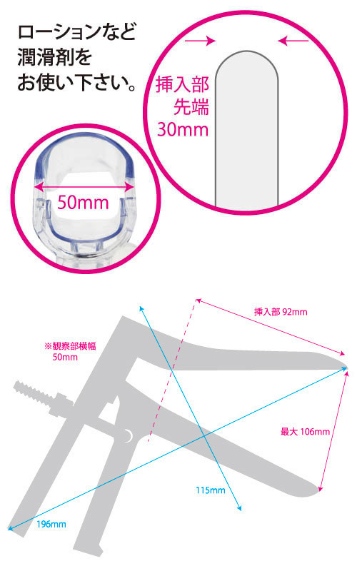 ●軽くて丈夫なプラスチック製●ヒンヤリ感がなくソフトな感触●透明なので当たる部分も丸見え●挿入部全長92mm×先端径30mm●最大開閉サイズは約10.6cm●ガッツリ使えるLサイズ。