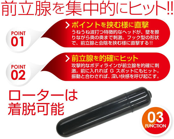 ●ややS字のようなフック型形状●複雑なうねり満載の凹凸ボディ●腸壁を刺激しながら奥まで進む●前立腺と会陰を挟むような構造●ヴァギナ使用でGスポ責めにも●ローター部分は取り外し可能●底部ボタンで3段階に調節OK。