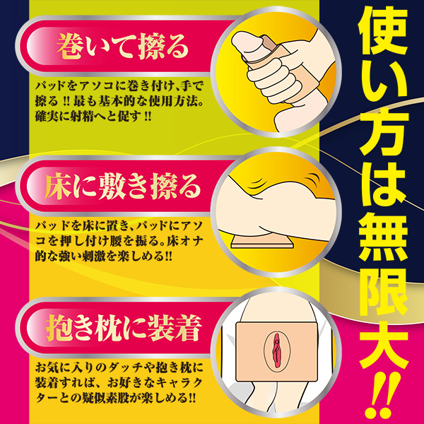パッドを床に敷くことで床オナのように使うこともできますし、等身大の抱き枕に付けてみたりと工夫次第で使い方は無限大!これを使って手コキのバリエーションを楽しもう♪ローション付属