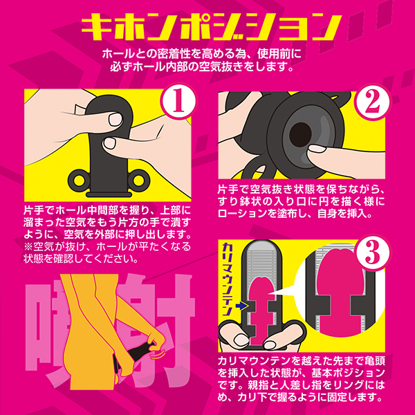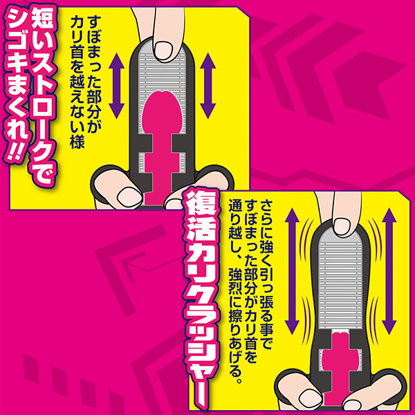 短いストロークでシゴきまくれば、カリ首を強烈に擦り上げる!!本体を伸ばさず手に持ってシコシコすれば通常ホールとして、引っ張って放してをくり返せば亀頭鍛錬グッズとしても使える。