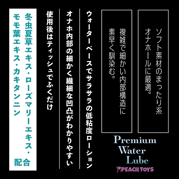 冬虫夏草エキス・ローズマリーエキス・モモ葉エキス・カキタンニン配合●ウォーターベースでサラサラの超低粘度ローション●オナホ内部の細かく繊細な凹凸がわかりやすい●使用後はティッシュでふくだけ簡単●無香料●安心の日本製●200ml スタンダード <成分>水、プロパンジオール、ヒドロキシエチルセルロース、乳酸、キサンタンガム、ローヤルゼリーエキス、アルギニン、マカエキス、水溶性コラーゲン、グリチルリチン酸2K、ローズマリーエキス、モモ葉エキス、カキタンニン、銀、フユムシナツクサタケエキス、クエン酸、クエン酸Na、BG、エタノール、セルロースガム、炭酸水素Na、フェノキシエタノール、EDTA-2Na、ブチルカルバミン酸ヨウ化プロピニル