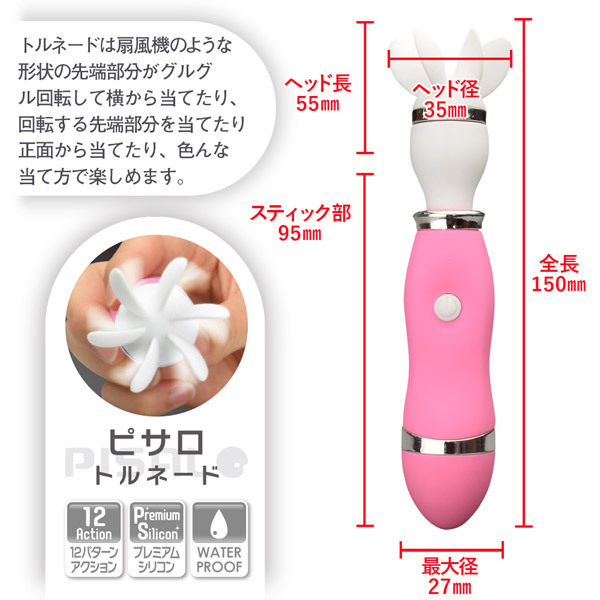 先端の羽がクルクルとトルネード回転!敏感な部分を横&正面から叩いて刺激する♪本体には柔らかなプレミアムシリコン素材で触り心地よく振動を軽減!長時間のプレイでも疲れにくい設計となっています。