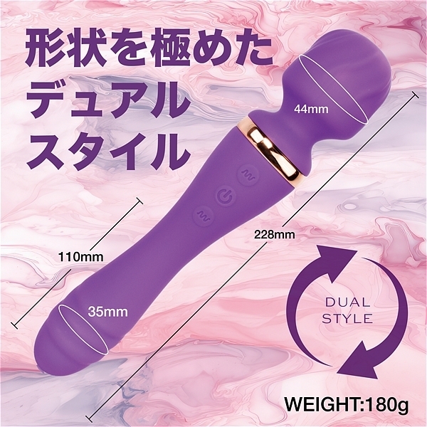 パッケージ:25.0×9.0×5.0cm 本体:全長22.8cm・電マ直径4.4cm・バイブ最大径3.5cm・挿入部全長11.0cm 重量:180g USB充電式