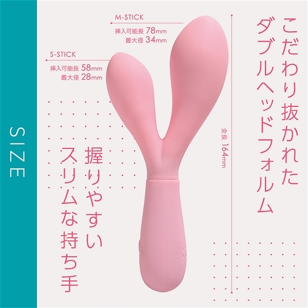 パッケージ:19.4×10.5×3.6cm 本体:全長16.4cm、大バイブ(挿入部全長7.8cm・最大径3.4cm)、小バイブ(挿入部全長5.8cm・最大径2.8cm) 重量:98g USB充電式