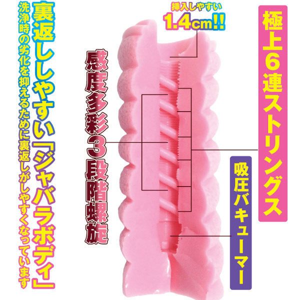 多彩な快感を生む6連ストリングスと、3段階の細かい螺旋ヒダで極上快感!内部のストリングスはカットして、自分好みにカスタマイズ可能!また、洗浄時に裏返しやすい蛇腹ボディを採用し、より扱いやすくなっています。