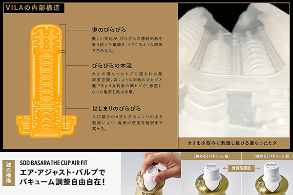 無段階で空気調整ができる画期的なソフト・オン・デマンド新ブランド「SOD BASARA」シリーズ新作!幾重にも連なるビラビラによる刺激が、先端から根元にかけて波のように押し寄せるヒダ特化型構造。