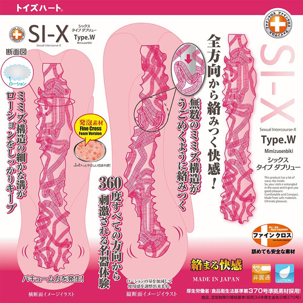 ●シックス・タイプ「W」ver●ふわっと優しく包み込む発泡素材を採用●内部:360℃配置した無数のミミズ千匹構造●細かな溝がローションをしっかりキャッチ●バキューム力も抜群●日本製・ローション付き。