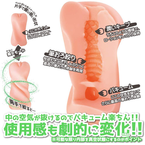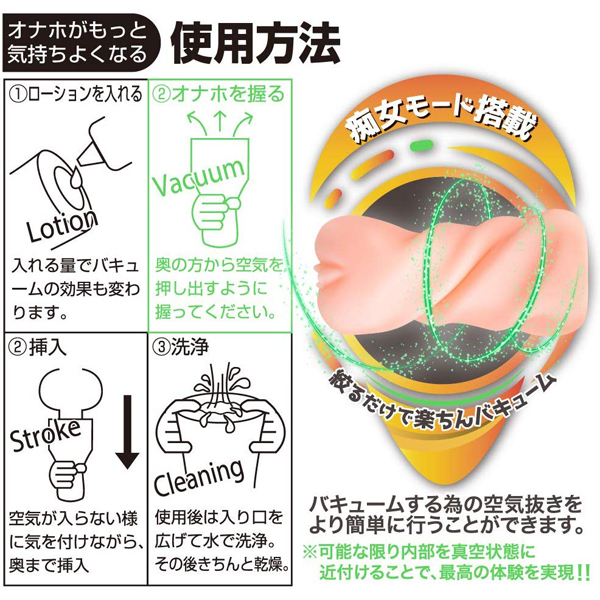 絞るだけで簡単に強力吸引!可能な限り内部を真空状態にすることでこれまでにない快感が得られます。