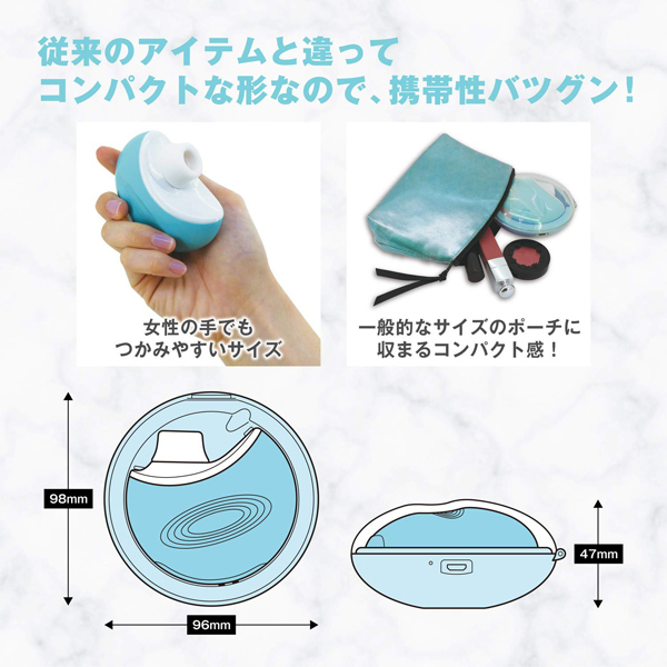 <ジューシーラムール・シークレットラブ>「吸って」「震える」CHU ROTORまるで美容家電!コンパクト型ケース付●Suction&Vibration・選べる吸引強弱と振動パターン・5段階吸引・6種振動●コンパクトケース付・水洗い可能・見つかってもばれにくい美容家電のようなパクト型ケース●Removable&Washable・見つかってもばれにくい美容家電のようなパクト型ケース・アタッチメント部分は取り外し可能・丸洗いできるためとても清潔●USBCharging・USB充電式●ケースに入れたまま充電可能、約110分の充電で約120分使用可能。