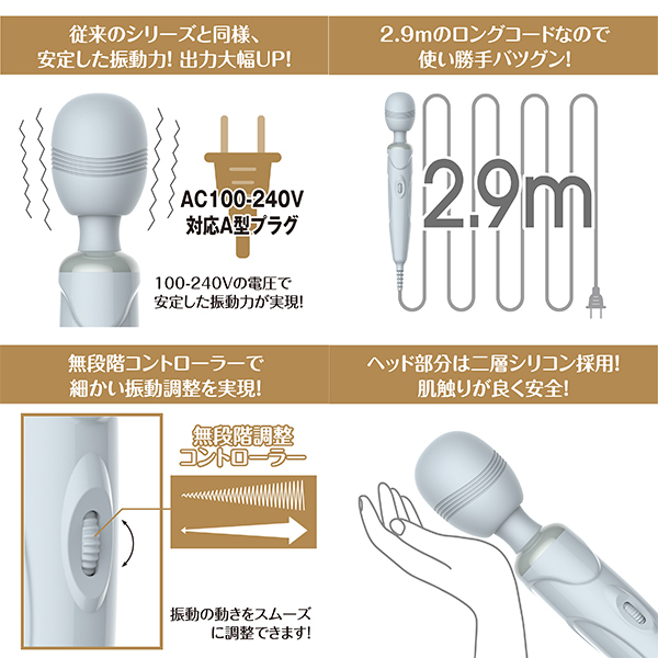 ・パワフルACアダプター使用・無段階調節コントローラー・静音・二層シリコン採用・強烈振動・自在に曲がるネック部分・2.9mのロングタイプコード・安心、安全の世界標準設計 <本体仕様電圧>AC100−240V対応プラグ