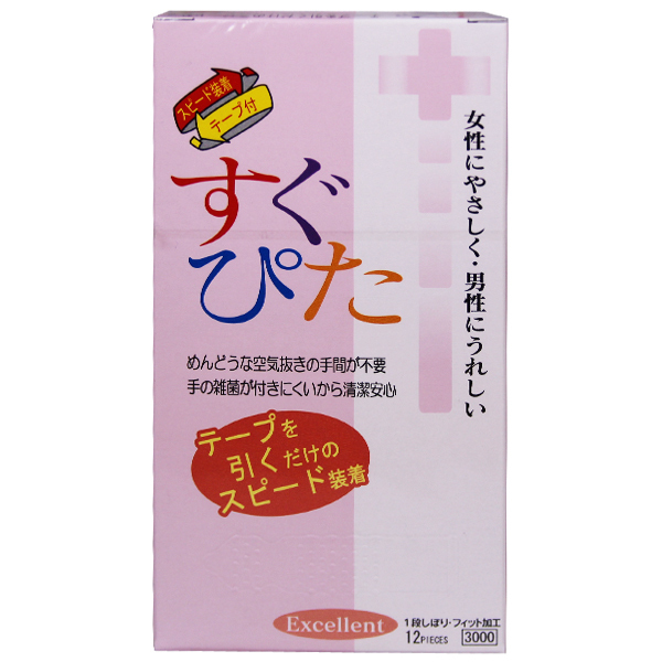 一度使ったらやめられない!テープを引くだけで簡単に装着できる、スピード装着テープ付きコンドーム「すぐぴた3000」12個入。