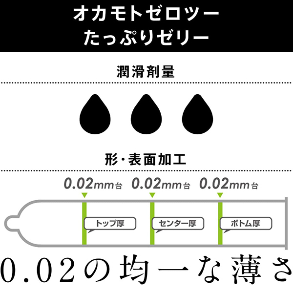 コンドームに塗布されるゼリーの量が多い商品を求める皆様にお応えした「オカモトゼロツー たっぷりゼリー」、ゼリー量200%(オカモトゼロツースタンダード比)、スムーズな挿入感を目指した女性にやさしいオカモトゼロツー。