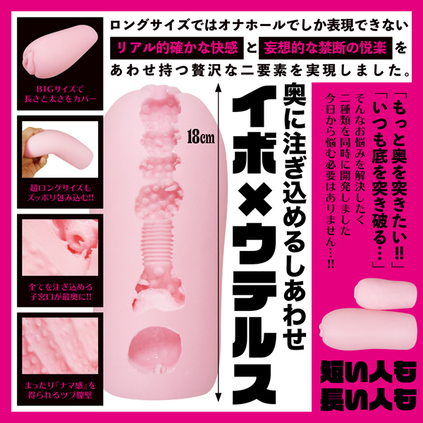 「底を突き破ってしまう…」という長い男性のお悩みに、イボ×ウテルス構造のロングオナホ(ローション付)。